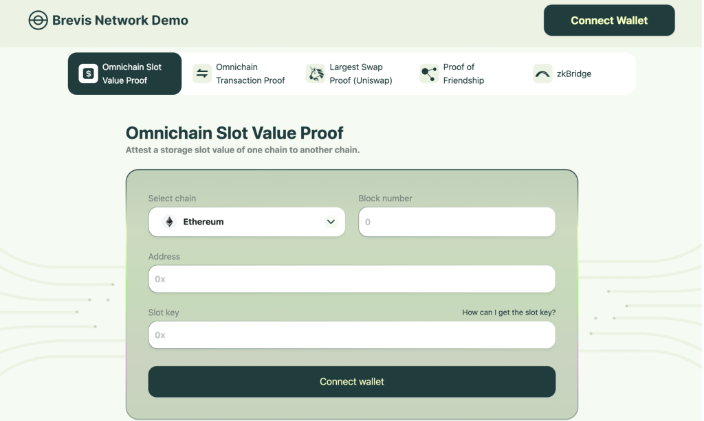 The Brevis framework also furnishes an API that facilitates ZK proof of any EVM storage slot value from a connected (same or remote) chain. Different from the Transaction and Receipt API, which focuses on dynamic actions, this API empowers developers to build smart contracts that can access a blockchain’s static state snapshot at any given time. To access certain storage slots’ values at a specific block number in a trust-free way, application builders need only invoke a SlotValue Verifier contract. You can experiment with this demo to better understand how it works.