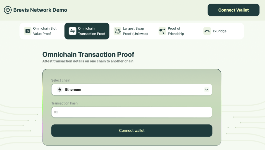 We’re thrilled to announce the launch of Brevis Alpha. This release provides developers with access to our innovative omnichain ZK co-processing SDK supporting ZK cross-chain interoperability, EVM storage slot value proof, EVM transaction proof, and EVM transaction receipt proof. Alongside this, we’ve launched a web UI that enables the developer community to explore all functionalities code-free. Engage with fun demo applications, such as the generation of “whale trader” NFTs based on your Uniswap trade history using Brevis, or validate on-chain friendships between two addresses based on historical transactions. It’s fun, try it out!