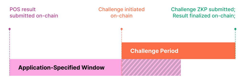 Within this system, anyone, including validators and developer-hosted challengers, can challenge a result by submitting a challenge claim along with a monetary bond on-chain. Please note that challengers are not required to present their challenge ZK proof to submit a challenge claim, but only need to declare the start of the challenge process on-chain should they detect any invalid result. Therefore, the application challenge window does not need to accommodate the time required to generate the challenge ZK proof and can generally be kept short.