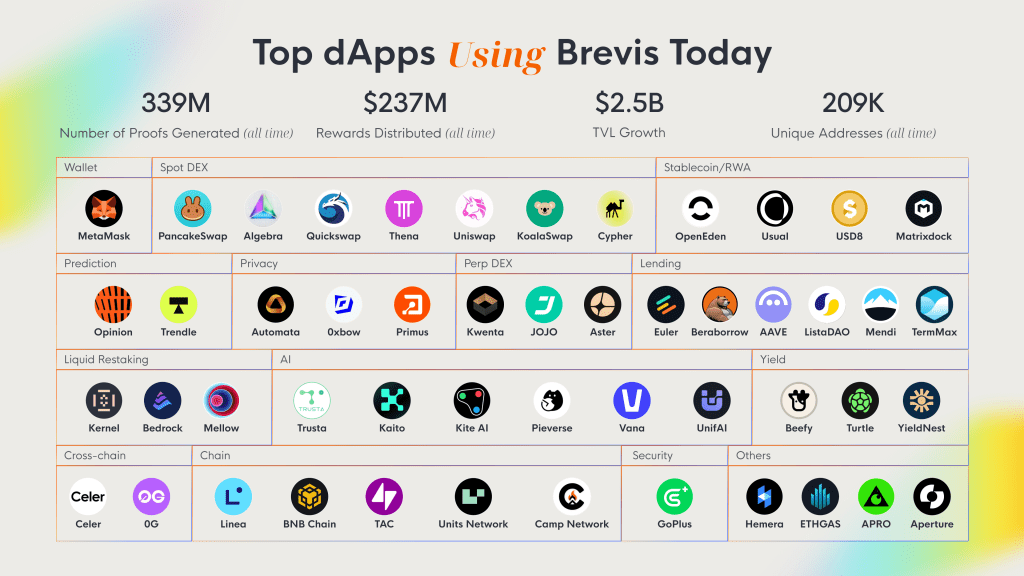 Brevis stands out not just for the ZK technology we’ve built, but for the live applications already running on it. Our infrastructure powers smart wallets with verifiable reputation, DEXes with volume-based discounts, yield optimizers with fair distributions, stablecoin protocols with continuous incentives, blockchain growth programs, liquid restaking rewards, lending protocol calculations, perpetual exchange loyalty systems, and AI personalization. Everything once considered impossible now runs trustlessly at scale.